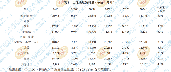 Notch咨詢公司預(yù)測(cè),受COVID-19新冠疫情 的影響,2020年橡膠消費(fèi)量將下降近10%至2610 萬噸。 下降的原因既有輪胎廠和工業(yè)橡膠制品廠 的直接關(guān)閉,也有因擴(kuò)大社交距離而產(chǎn)生的影響, 如對(duì)新車銷量和行駛里程的影響。但,2020年下 半年,尤其是第四季度的情況有所好轉(zhuǎn),減緩了下 降速度。Notch預(yù)測(cè),全球需求將在2021年恢復(fù)到 COVID之前的水平,長(zhǎng)遠(yuǎn)來看增長(zhǎng)情況還是較好 的。預(yù)計(jì)橡膠消費(fèi)量將從2019年起以每年3.5%的 速度增長(zhǎng),到2024年將達(dá)到3430萬噸。輪胎市場(chǎng) 將推動(dòng)這一增長(zhǎng)。