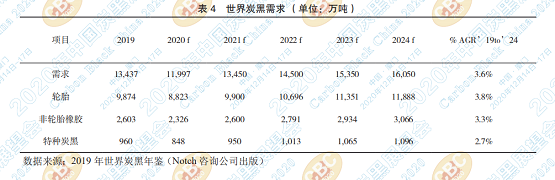 據(jù)預(yù)測(cè),從2019年到2024年,全球炭黑需求 將以每年3.6%的速度增長(zhǎng),到2024年將達(dá)到1610 萬噸(見表4)。據(jù)Notch咨詢公司預(yù)測(cè),受COVID-19 新冠病毒的影響,全球炭黑需求在2020年將下降 近11%至1200萬噸。但是,今年下半年炭黑市場(chǎng) 似乎正在復(fù)蘇中,到第四季度,由于輪胎生產(chǎn)的剛性會(huì)導(dǎo)致某些炭黑市場(chǎng)供應(yīng)緊張。Notch公司預(yù) 計(jì),炭黑產(chǎn)量將在2021年恢復(fù)到COVID之前的水 平。從長(zhǎng)遠(yuǎn)來看,2019年至2024年期間,全球宣 布對(duì)輪胎產(chǎn)能進(jìn)行211億美元的新投資,將推動(dòng)炭 黑需求。雖然COVID-19導(dǎo)致許多項(xiàng)目延期,但隨 著擴(kuò)建項(xiàng)目的恢復(fù),炭黑市場(chǎng)的長(zhǎng)期前景依然看好。
