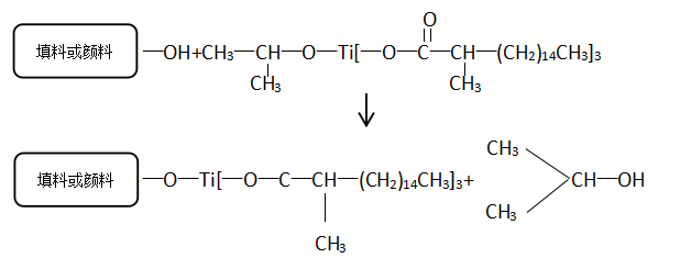 目前常用的偶聯(lián)劑可以分為硅燒、鉻化合物、鈦酸酯和鋁酸脂四大類(lèi),其中后兩者較適用于顏料-熱塑性樹(shù)脂體系。典型代表為三異硬脂?;佀岙惐?TTS),其偶聯(lián)機(jī)理如下: