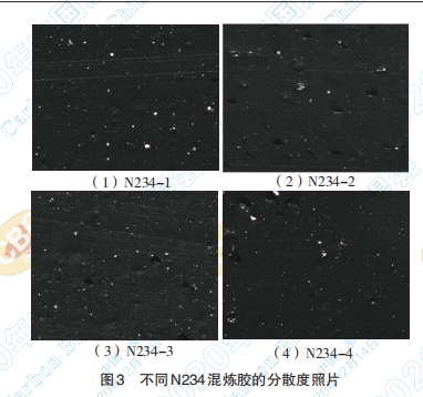 由圖 3 和表 6 可以看出,炭黑的結(jié)構(gòu)度越高, 在橡膠中的分散性越好,因?yàn)樘亢诘慕Y(jié)構(gòu)度越高, 表明炭黑越松散,雖然混煉過(guò)程中需要更多的混 煉時(shí)間,但是炭黑分散性能越好,所以 N234-1 和 N234-3的分散度較好,而N234-2因?yàn)樘盍现g的 相互作用力較弱,易混煉,因此分散性也較好。