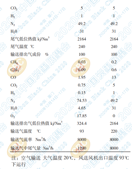 由于空氣開路輸送方式的尾氣需要放空,因 此當(dāng)炭黑尾氣泄露到輸送氣里的量占輸送氣量 30%狀況下運行時,這種條件下浪費的尾氣各詳細(xì) 數(shù)據(jù)見下表 2。