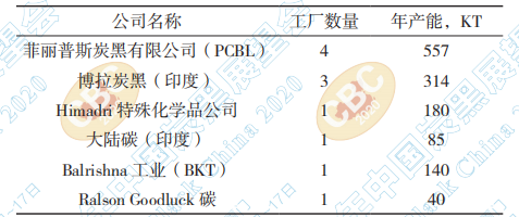2020年印度炭黑制造商11家炭黑工廠(chǎng)的年產(chǎn) 能為1316KT,具體如下表所示。