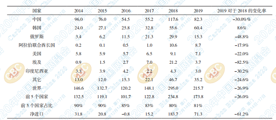從表 B 可看出,2019 年的凈進(jìn)口量為 71KT, 比 2018 年的 184KT 下降了 61%,同時(shí) 2018 年的出 口數(shù)據(jù)極低,進(jìn)口數(shù)據(jù)極高,尤其是來(lái)自中國(guó)的進(jìn) 口。