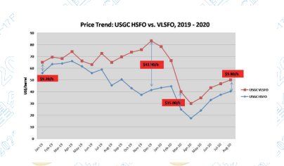 雖然最終HSFO和VLSFO的價(jià)格會(huì)得以恢復(fù), 但 2020 年整個(gè)夏季兩者間的價(jià)差仍然很窄。隨著 開(kāi)工率的下降,HSFO 需求的上漲,F(xiàn)CC 工廠(chǎng)運(yùn)營(yíng) 的改變,HSFO作為焦化原料的應(yīng)用以及更多配備 有洗滌系統(tǒng)船舶公司的出現(xiàn),2020 年第 4 季度和 2021 年 將 會(huì) 有 優(yōu) 質(zhì) 的 高 硫 含 量 澄 清 CBFS。 IMO2020 設(shè)想下并沒(méi)有實(shí)現(xiàn)高硫含量供應(yīng)過(guò)剩的 預(yù)期。相反,雖然同中國(guó)向南亞(包括印度和泰 國(guó))銷(xiāo)售的 CBO 混合油(CBFS 來(lái)源)相比,美國(guó) 的澄清油在交貨價(jià)格上更具競(jìng)爭(zhēng)力,但美國(guó)墨西 灣地區(qū)可能會(huì)出現(xiàn)澄清油(炭黑原料油)供應(yīng)短 缺。