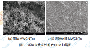 碳納米管改性前后 SEM 掃描圖見圖 3,從圖 3 (a)中可以看出原始 MWCNTs 管長度較長,極易 彎曲,彼此穿插,管與管間非常密集地相互纏繞 。 圖 3(b)為經(jīng)短切酸處理改性的 MWCNTs 管長度 相對于未處理的原始 MWCNTs 較短,且混酸處理 后的碳管團(tuán)聚程度明顯降低。