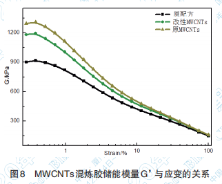 采用橡膠加工分析儀對胎面膠進(jìn)行應(yīng)變掃描 測 試,原 始 MWCNTs 與 改 性 MWCNTs 相 同 用 量(3phr)時(shí)的動態(tài)性能變化。 MWCNTs混煉膠儲能 模量 G’與應(yīng)變的關(guān)系見圖 8。