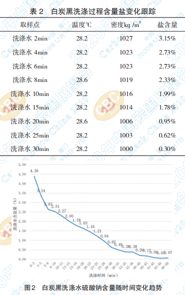 圖表2和圖2所示,通過對洗滌過程洗滌水的 取樣檢測分析,測定不同時間段的洗滌水密度進 行檢測,通過含鹽量和密度的換算公式計算,得 出洗滌過程中洗滌水鹽含量變化與洗滌時間的變 化趨勢圖。