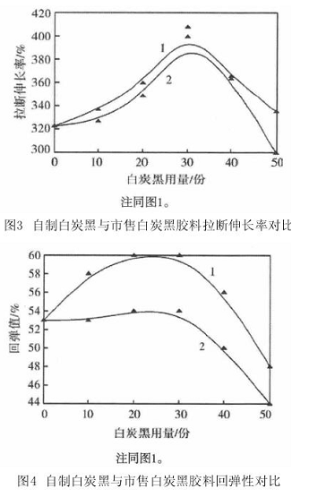 自制白炭黑與市售白炭黑的耐屈撓龜裂性能試驗(yàn)結(jié)果為:自制白炭黑和市售白炭黑用量為0~50份時(shí),膠料屈撓6萬(wàn)次未出現(xiàn)屈撓龜裂現(xiàn)象。這說明自制白炭黑和市售白炭黑在偶聯(lián)劑的作用下與橡注同圖1。