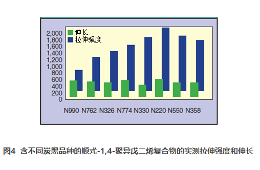 圖1、圖2和圖3均表明,一次聚集體及包含其的球形粒子的性能是決定炭黑性能的重要因素。由更細(xì)的原生粒子炭黑賦予的高表面積需要更多的能量使其潤濕和分散,且每單位重量的炭黑趨于“綁縛”更多的橡膠,導(dǎo)致膠料比含較粗粒炭黑的膠料更硬。如圖4所示,硫化復(fù)合物的拉伸強(qiáng)度與復(fù)合物所含炭黑的DPBA吸收值具有良好的相關(guān)性。這里需要注意的是,在圖4中,炭黑表面積或聚集體結(jié)構(gòu)的變化影響了拉伸強(qiáng)度,但是隨著炭黑表面積的變化,伸長率卻依然幾乎保持不變。我們用振動光譜分析這兩種橡膠的結(jié)構(gòu)變化時,將會討論這些差異。
