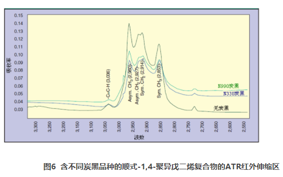 從圖6可明顯看出,對于CH伸縮區(qū)域,不含炭黑的聚合物與含N990的聚合物和含N330的聚合物存在本質(zhì)的強(qiáng)度差異。這些差異與炭黑和聚異戊二烯之間的相互作用有關(guān)。