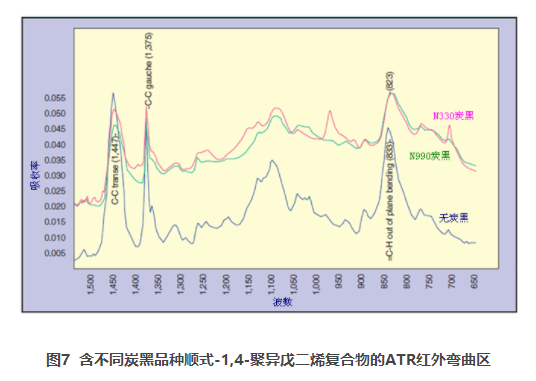 圖7中,當(dāng)順式-1,4-聚異戊二烯與N-330炭黑一起混煉時,1447cm-1吸收帶的強(qiáng)度相對于1375cm -1有所提高,而當(dāng)這種合成橡膠與N990炭黑一起混煉時,這一比率則略有下降。這兩個頻帶分別歸屬于可自由旋轉(zhuǎn)的C-C鍵的反式構(gòu)象和反式構(gòu)象的彎曲振動。在這里,應(yīng)當(dāng)指出的是,本研究使用的其它炭黑的紅外光譜數(shù)據(jù)表明了類似的行為模式。833cm -1處的譜帶歸屬給了順式-1,4-聚異戊二烯= CH非平面彎曲模式,以便用作參考峰對該聚合物的不同復(fù)合物的1400 -1區(qū)域強(qiáng)度進(jìn)行比較。我們注意到,隨著炭黑DBP吸收值的增加,計算出的光譜中1447cm-1譜帶與1375cm-1譜帶之比例會稍有增大。因而,炭黑與聚合物間的相互作用會導(dǎo)致優(yōu)選構(gòu)象的喪失,不難想象這是由于該聚合物形成了強(qiáng)吸收的表面層。