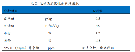 為了了解無機炭黑的粒徑及結(jié)構(gòu),我們按照炭黑的分析方法對表征炭黑性能的幾個指標(biāo)進(jìn)行了分析,分析結(jié)果如表2.