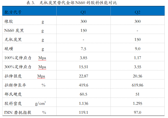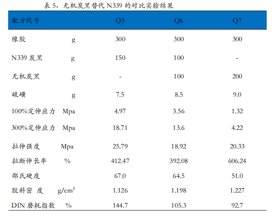 4. 無機炭黑可沖毀分替代N660炭黑,應(yīng)用于內(nèi)胎等,但其成本下降有限。不可能替代硬質(zhì)炭黑應(yīng)用于胎體膠及胎面膠中。