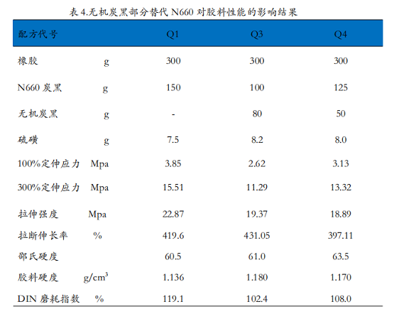 Ⅰ. 在標(biāo)準(zhǔn)配方中將N134炭黑減少30g,添加60g無機炭黑,即改變炭黑量為20%時,100%定伸應(yīng)力和300%定伸應(yīng)力下降約25%,拉伸強度下降10%,拉斷伸長率有所提高,膠料硬度降低2度,膠料比重增加3.5%,DIN耐磨指數(shù)降低16.7%。