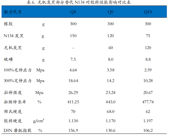 1. 無機炭黑應(yīng)用于膠料標(biāo)準(zhǔn)配方中,全部替代時,不論是哪種炭黑對比,其100%定伸應(yīng)力、300%定伸應(yīng)力均有較大下降,下降約70%,拉伸強度下降約25%,硬度下降11-15%,膠料的密度增加約5-10%,耐磨指數(shù)降低了30-40%。膠料密度增加,膠料體積變小,相對于輪胎來說,單位體積的輪胎重量增加,成本提高。