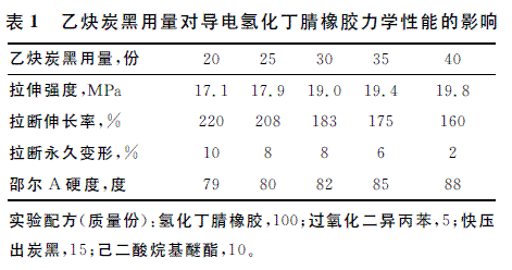 本工作測試了乙炔炭黑不同用量的導(dǎo)電氫化丁腈橡膠力學(xué)性能,結(jié)果見表1。