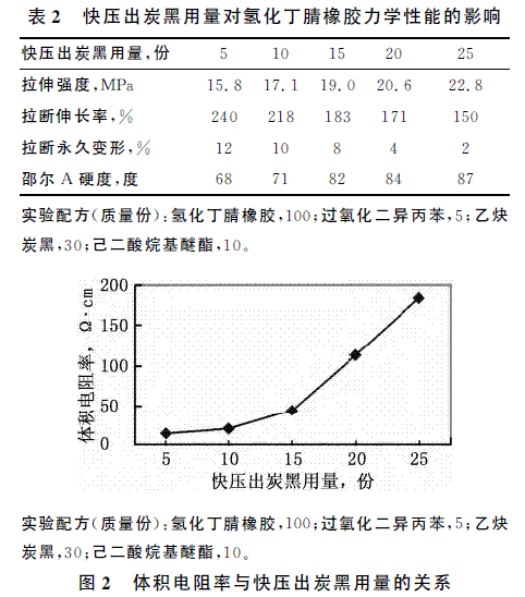 本工作測試了快壓出炭黑不同用量的導(dǎo)電氫化丁腈橡膠的力學(xué)性能和體積電阻率,結(jié)果見表2和圖2。