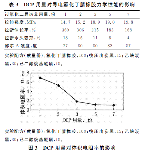 過氧化二異丙苯(DCP)用量對氫化丁腈橡膠電性能的影響見圖3。從圖3可看出,當(dāng)DCP用量較少且不足3份時,隨著DCP用量的增大,膠料的體積電阻率大幅下降。當(dāng)DCP用量在3~7份時體積電阻率變化較為平緩,當(dāng)DCP用量在3~5份范圍內(nèi)膠料的力學(xué)性能相對較好。