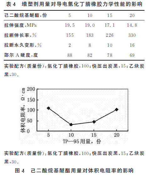 本工作測試了己二酸烷基醚酯(TP-95)不同用量的導(dǎo)電氫化丁腈橡膠的力學(xué)性能和體積電阻率,結(jié)果見表4和圖4。