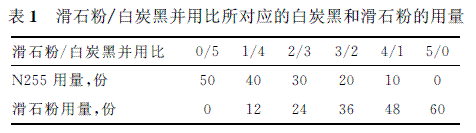 NBR,LG6280,韓國現(xiàn)代(LG)公司;白炭黑,N255(沉淀法,1000目,密度約2.32g/cm3),南吉化學(xué)工業(yè)有限公司;滑石粉,8000目,密度約2.78g/cm3,桂林龍勝日升超細滑石粉有限公司;其他配合劑均為橡膠工業(yè)市售品。