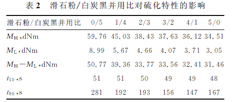 表1為滑石粉/白炭黑并用比所對應(yīng)的白炭黑和滑石粉的用量,即0~100%的白炭黑被滑石粉等體積取代,由兩者密度計算出1.2份滑石粉與1份白炭黑體積相當(dāng)。