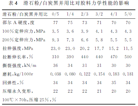 滑石粉/白炭黑并用比對膠料力學(xué)性能的影響如表4所示。隨著并用比的增加,膠料的硬度、200%定伸應(yīng)力、拉伸強度、撕裂強度均逐漸下降,耐磨性能減弱,但100%定伸應(yīng)力稍有增大,對回彈性能無影響,壓縮永久變形性能改善。因此,滑石粉的加入使力學(xué)性能降低,最高取代量不能超過60%。在密封領(lǐng)域,如O 型圈和骨架油封來說,小定伸應(yīng)力提高對于產(chǎn)品的使用性能是有利的。但耐磨性降低不利于動密封的使用,需要加入適量的潤滑劑提高耐磨性。