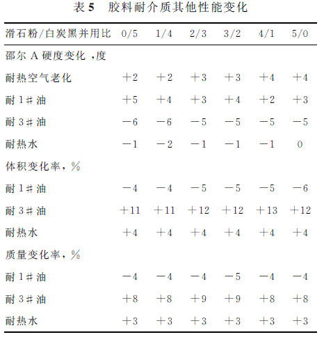 分別選擇1#標準油,3#標準油,水,熱空氣作為介質(zhì),對膠料進行測試,耐油測試條件為100℃×70h,耐水測試條件為99℃×70h,熱空氣老化測試條件為100℃×70h,結(jié)果如圖1及表5所示。