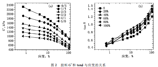 拉伸剪切強度:按GB/T 13936-1992測試,剪切拉伸速度為50mm/min;RPA 應(yīng)變掃描:溫度60℃,頻率1Hz,應(yīng)變范圍為0.27%~98%;壓縮永久變形:按GB/T 7759-1996測試,B型試樣,測試條件為100℃×70h,壓縮率25%;耐油性能:ASTM-1#和3#標準油,測試條件為100℃×70h;其他各項性能均按相應(yīng)最新國家準標進行測試。