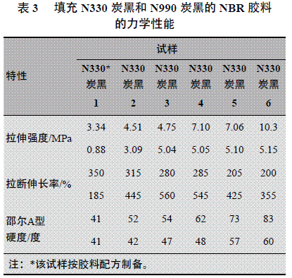 對(duì)于N330炭黑和N990炭黑填充丁腈橡膠,當(dāng)炭黑含量為100份時(shí)皆獲得了最大拉伸強(qiáng)度值。在這一配合試驗(yàn)中,含粒度更細(xì)的N330炭黑膠料的拉伸強(qiáng)度比含N990炭黑膠料的高。