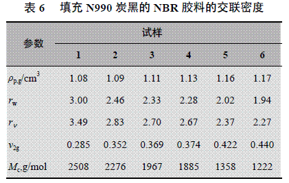 表6列示了硫化膠的交聯(lián)密度和有效交聯(lián)鍵之間的分子鏈的數(shù)均分子質(zhì)量(MC)的計(jì)算值。