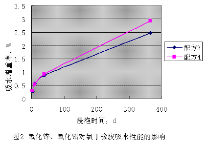 氯丁橡膠一般使用金屬氧化物進(jìn)行硫化交聯(lián),其中最常使用的即為氧化鋅。配方3 與配方4比較了氧化鋅與氧化鉛對(duì)吸水性能的影響。數(shù)據(jù)見(jiàn)圖2所示。