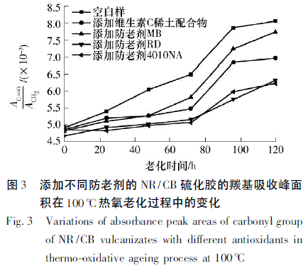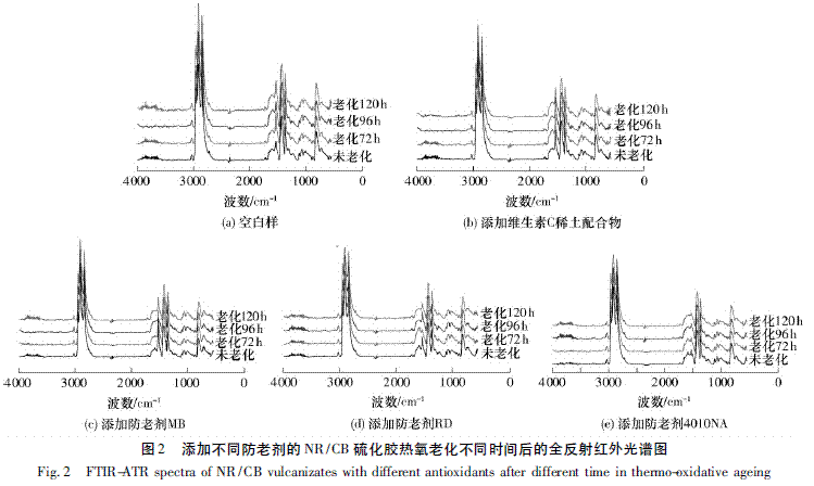 采用Nicolet 公司生產(chǎn)的Migna 760 型傅里葉變換紅外光譜儀測定添加不同防老劑的NR/CB 硫化膠熱氧老化不同時(shí)間后的傅里葉變換全反射紅外光譜( FTIR-ATR) .