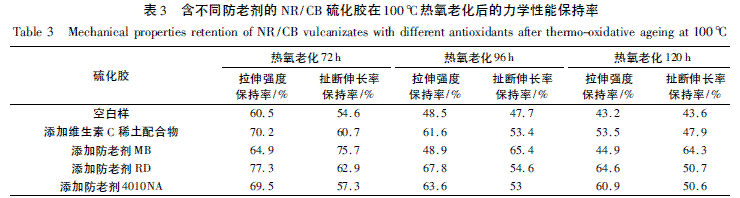 添加不同防老劑的NR/CB 硫化膠在100 ℃下熱氧老化不同時(shí)間后的拉伸強(qiáng)度和扯斷伸長保持率的變化如表3 所示. 由表3 可見,含維生素C 稀土配合物的硫化膠的拉伸強(qiáng)度保持率優(yōu)于含防老劑MB的硫化膠、低于含防老劑RD 和4010NA 的硫化膠;而含維生素C 稀土配合物的硫化膠的扯斷伸長率保持率與含RD 和4010NA 的硫化膠相近、但低于含MB 的硫化膠. 綜合來看,維生素C 稀土配合物的防熱氧老化效果介于防老劑RD、4010NA 與MB 之間,其結(jié)果與FT-IR 結(jié)果一致.