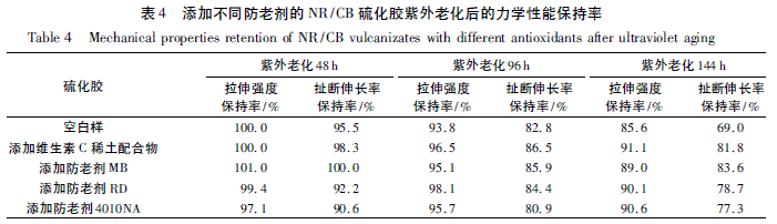 添加不同防老劑的NR/CB 硫化膠在紫外光老化箱中分別老化48、96、144 h 后的力學(xué)性能保持率如表4 所示.