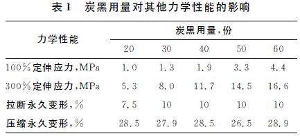 表1給出了炭黑用量對AEM 硫化膠其他力學性能的影響。從表1可看出,100%定伸應力和300%定伸應力都隨炭黑用量的增加而增大;當炭黑用量超過30份時,拉斷永久變形不再隨炭黑用量的增加而變化。