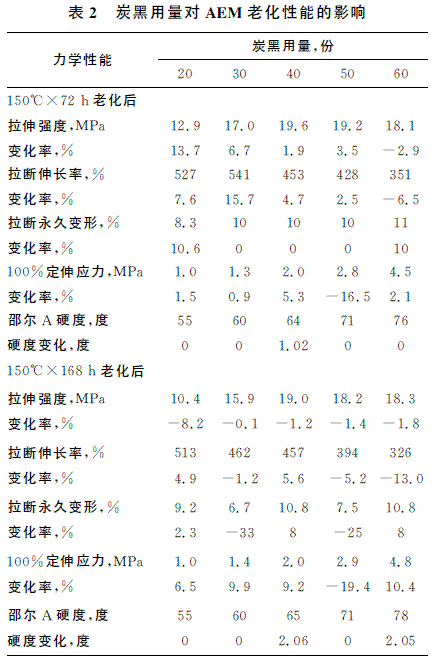 表2為炭黑用量對AEM硫化膠老化性能的影響。