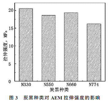 (2)使用炭黑N330,N550,N660和N774補強AEM 橡膠時,N330補強的硫化膠拉伸強度和撕裂強度均最高,分別為20.5MPa和42.7kN/m,N550的具有最高定伸應力和較好壓縮永久變形,N660的力學性能較均衡,而N774的補強效果較差,永久變形最大;粒徑較小的炭黑補強的硫化膠具有較優(yōu)異的耐老化性能。