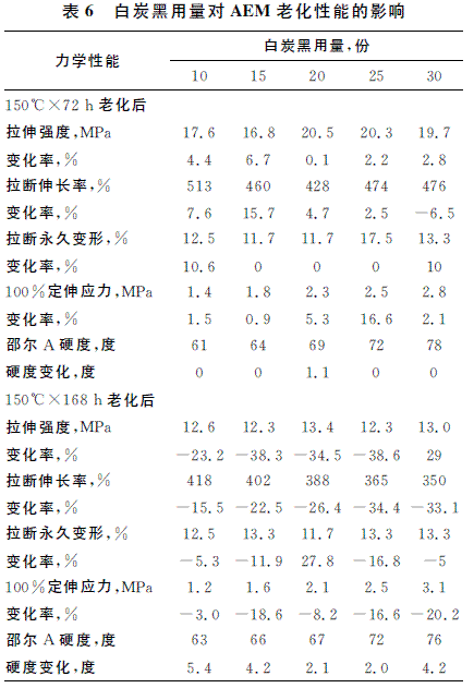 本實驗分別在150℃×72h和150℃×168h條件下測試了白炭黑不同用量的硫化膠老化性能,并研究了白炭黑用量對AEM硫化膠力學性能的影響。