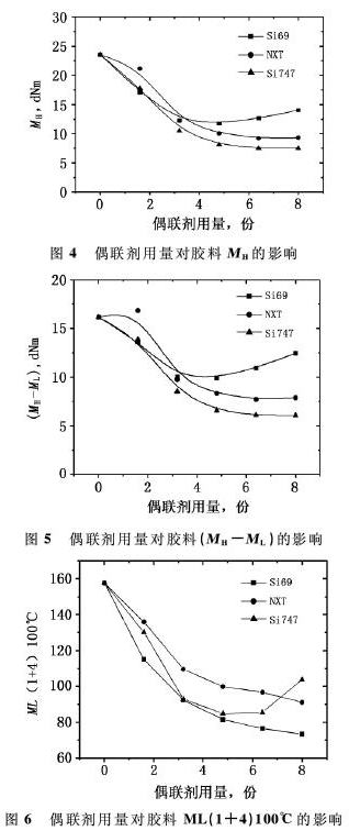1)偶聯(lián)劑NXT具有較好的抗焦燒性能,在偶聯(lián)劑用量較高時這種優(yōu)勢更加明顯,3種偶聯(lián)劑抗焦燒能力的順序為:NXT>Si69>Si747。