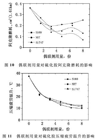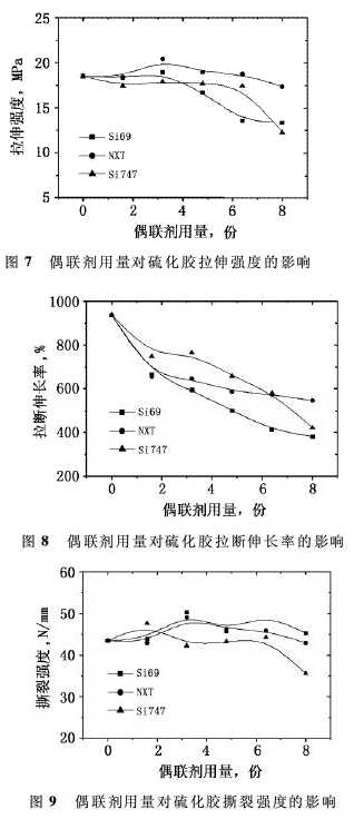 由圖7可看出,NXT改性體系硫化膠的拉伸強(qiáng)度,在實驗用量范圍內(nèi)變化不大,但Si69和Si747改性體系,當(dāng)偶聯(lián)劑用量分別達(dá)到3.2份和6.4份后,硫化膠的拉伸強(qiáng)度明顯下降。3種偶聯(lián)劑改性體系硫化膠的拉斷伸長率,均隨著偶聯(lián)劑用量的增加明顯下降,但NXT改性體系硫化膠的拉斷伸長率,當(dāng)NXT用量達(dá)到1.6份后,降低程度明顯減小。由圖10可看出,Si69改性體系硫化膠的阿克隆磨耗體積,隨著Si69用量的增加逐漸減小,當(dāng)Si69用量超過3.2份后,硫化膠的阿克隆磨耗體積呈增大趨勢;NXT和Si747改性體系硫化膠的阿克隆磨耗,隨著偶聯(lián)劑用量的增加變化趨勢基本相同,當(dāng)偶聯(lián)劑用量分別大于3.2和4.8份后,硫化膠的阿克隆磨耗體積呈增加趨勢。