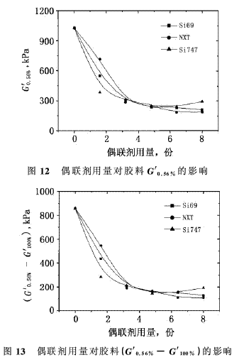 3)Si69改性體系膠料和硫化膠的G′0.56%和G′0.56%-G′100%,隨Si69用量增加明顯降低,當(dāng)Si69用量達(dá)到3.2份后,變化不大;NXT和Si747改性體系膠料和硫化膠的G′0.56%和G′0.56%-G′100%均隨偶聯(lián)劑用量的增加明顯降低,膠料和硫化膠的G′0.56%和G′0.56%-G′100%,當(dāng)NXT和Si747用量分別達(dá)到3.2份和6.4份后,變化不大,同時偶聯(lián)劑用量達(dá)到4.8份后,NXT和Si747改性體系硫化膠的Payne效應(yīng)明顯較Si69改性體系小。
