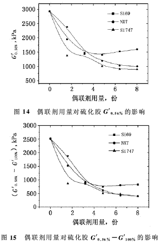 由圖12可看出,3種偶聯(lián)劑改性體系,偶聯(lián)劑用量對膠料的G′0.56%和G′0.56%-G′100%的影響變化趨勢基本相同,均隨著偶聯(lián)劑用量的增加急劇下降,當(dāng)偶聯(lián)劑用量達(dá)到4.8份后,Si69和NXT改性體系膠料的G′0.56%和G′0.56%-G′100%略有降低,但Si747改性體系膠料的G′0.56%與G′0.56%-G′100%略有增加,說明此時Si747改性體系膠料有焦燒傾向,導(dǎo)致膠料的G′0.56%與G′0.56%-G′100%略有增加。膠料G′0.56%與G′0.56%-G′100%的減小,主要是由于膠料中硅烷的烷氧基與白炭黑表面的硅醇基團(tuán)發(fā)生反應(yīng),白炭黑表面的硅醇基團(tuán)的數(shù)目隨著硅烷用量的增大而降低,改善了白炭黑在膠料中的分散性,在應(yīng)變作用下,填料網(wǎng)絡(luò)逐漸被破壞,導(dǎo)致了低應(yīng)變下模量的下降,白炭黑之間的網(wǎng)絡(luò)效應(yīng)減弱,Payne效應(yīng)減弱,如圖13所示。