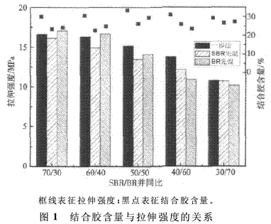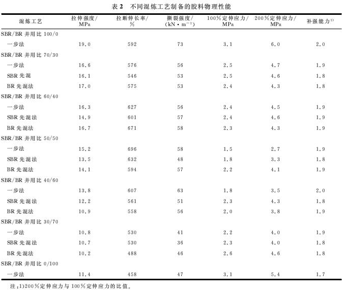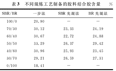 (1)對(duì)于SBR/BR/白黑膠料,一步法膠料的拉伸強(qiáng)度和結(jié)合膠含量比分段投膠混煉法膠料大,這在于一步法膠料的白炭黑潤(rùn)濕效果好。