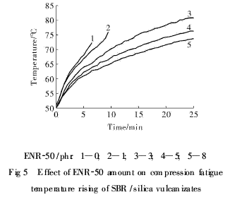 不同ENR-50用量的SBR/silica復(fù)合材料硫化膠的壓縮疲勞生熱曲線如圖5所示,其中未加和只加1份ENR的試樣均未能完成測(cè)試,中途爆裂。從圖5可以看出,隨著ENR-50用量的增加,硫化膠壓縮疲勞生熱速率減慢,溫升值也減小,說明ENR的加入改善了SBR/silica體系的壓縮疲勞生熱性能。這是由于ENR促進(jìn)了白炭黑的分散,并加強(qiáng)了丁苯橡膠與白炭黑的界面結(jié)合,從而使得填料與橡膠之間的摩擦生熱減小導(dǎo)致的結(jié)果。