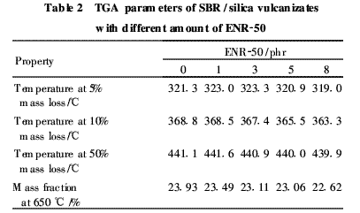 從表2可以看出,當(dāng)ENR-50的用量不超過3份時(shí), SBR/silica復(fù)合材料硫化膠的熱穩(wěn)定性能基本得到保持,但是繼續(xù)增加ENR-50用量復(fù)合材料的熱穩(wěn)定性能略有下降。