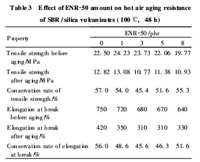 少量ENR-50的加入能有效降低SBR/silica復(fù)合材料中白炭黑的聚集,改善白炭黑在橡膠基質(zhì)中的分散狀況,提高復(fù)合材料硫化膠的定伸應(yīng)力、拉伸強(qiáng)度、撕裂強(qiáng)度和耐磨性能,降低動(dòng)態(tài)壓縮疲勞生熱速率和溫升值,同時(shí)使復(fù)合材料硫化膠在滾動(dòng)阻力不變的情況下抗?jié)窕阅苊黠@改善。添加少量ENR-50對(duì)復(fù)合材料硫化膠的耐熱性能無明顯影響,但會(huì)導(dǎo)致材料的耐熱空氣老化性能下降。當(dāng)ENR-50加入量為3份左右時(shí),SBR/silica復(fù)合材料硫化膠的綜合性能最佳。少量ENR對(duì)SBR/silica復(fù)合材料性能的改進(jìn)結(jié)果說明ENR是該復(fù)合材料一種優(yōu)良的大分子界面改性劑。