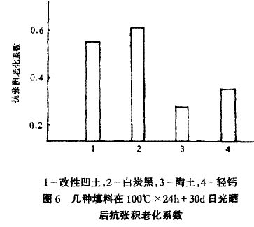 填充膠經(jīng)100℃ x 24h熱老化,又在日光下放置1個月后,測定硫不掃佼的抗張積老化系數(shù),如圖6所示。