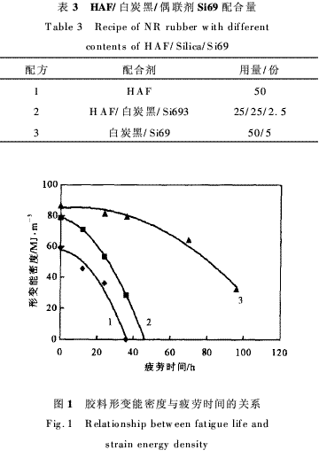 分別采用HAF、HAF/白炭黑/Si69、白炭黑/Si69 3種補(bǔ)強(qiáng)體系補(bǔ)強(qiáng)膠料,測(cè)定膠料在疲勞過(guò)程中形變能密度的變化。HAF/白炭黑/偶聯(lián)劑Si69配合量見(jiàn)表3。拉伸比λ=1·50,疲勞機(jī)轉(zhuǎn)速為500r·min-1時(shí),對(duì)3種補(bǔ)強(qiáng)的硫化膠試樣經(jīng)疲勞試驗(yàn)一定時(shí)間后,分別對(duì)其進(jìn)行拉伸,通過(guò)應(yīng)力-應(yīng)變曲線下的面積積分得到形變能密度,形變能密度與疲勞時(shí)間之間的關(guān)系見(jiàn)圖1。