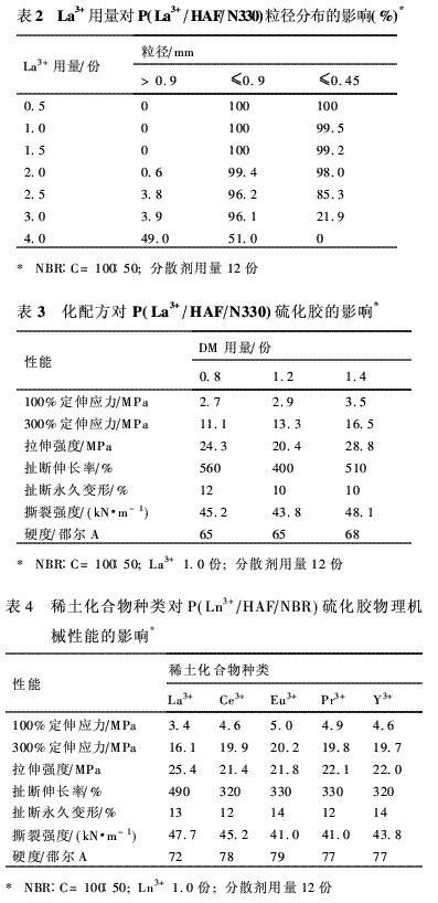 顯然,在眾多的影響因素中,這是最重要和必須首先選擇確定的,實驗結(jié)果列于表3。由表可見,與其他兩種DM用量所得的結(jié)果進行比較,當DM用量為1.4份時,硫化膠的拉伸強度最高(28.8 MPa),伸長率為510%,其他性能則基本相同。所以本文確定硫化配方中的DM為1.4份。2.2.2 稀土化合物種類對P(Ln3+/HAF/N330)硫化膠物理機械性能的影響表4表示不同稀土化合物對P(Ln3+/HAF/NBR)硫化膠物理機械性能的影響。由表4可見,就綜合性能而言, La3+比其他Ln3+化合物優(yōu)越。特別是拉伸強度、撕裂強度和伸長率則明顯優(yōu)于其他Ln3+化合物。所以進一步的工作為研究La3+用量對P(Ln3+/HAF/NBR)硫化膠物理機械性能的影響,以確定其最佳用量。
