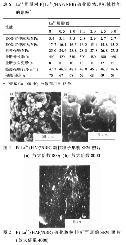 3. P(La3+/HAF/NBR)硫化膠拉伸斷面形貌的SEM照片分析說明, La3+改善硫化膠物理機械性能的根本原因在于炭黑粒子得以充分分散并與膠乳粒子粘結(jié)良好;炭黑粒子在硫化膠基體中均勻分散,并且兩者黏結(jié)牢固。